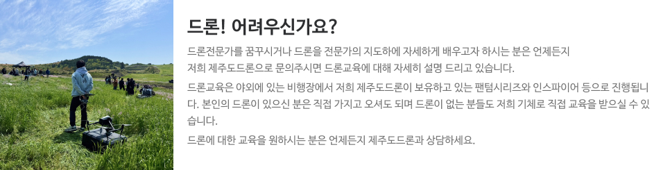 - 제주도드론의 전문 강사의 교육을 통해 진행되며, 총 8시간 과정으로 이루어집니다.